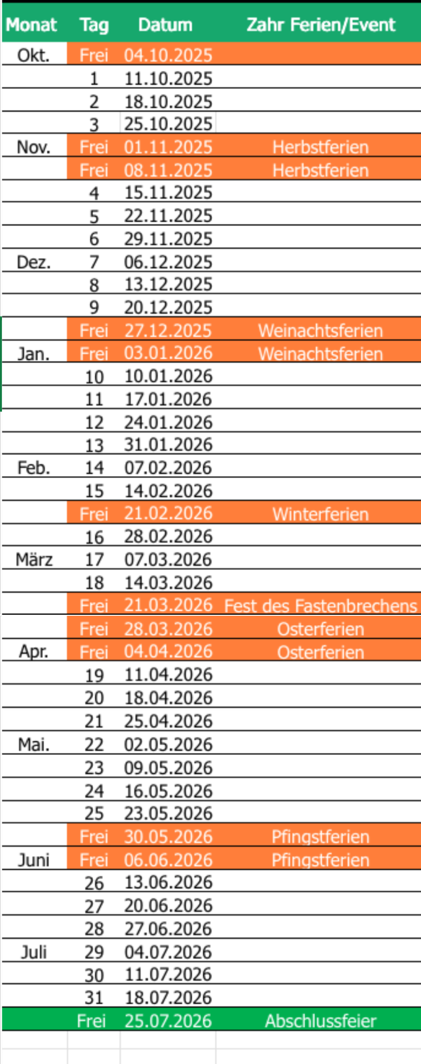 Das Schuljahr beginnt im Oktober und endet im Juli des nächsten Jahres. Wir berücksichtigen natürlich die Schulferien der deutschen Schulen